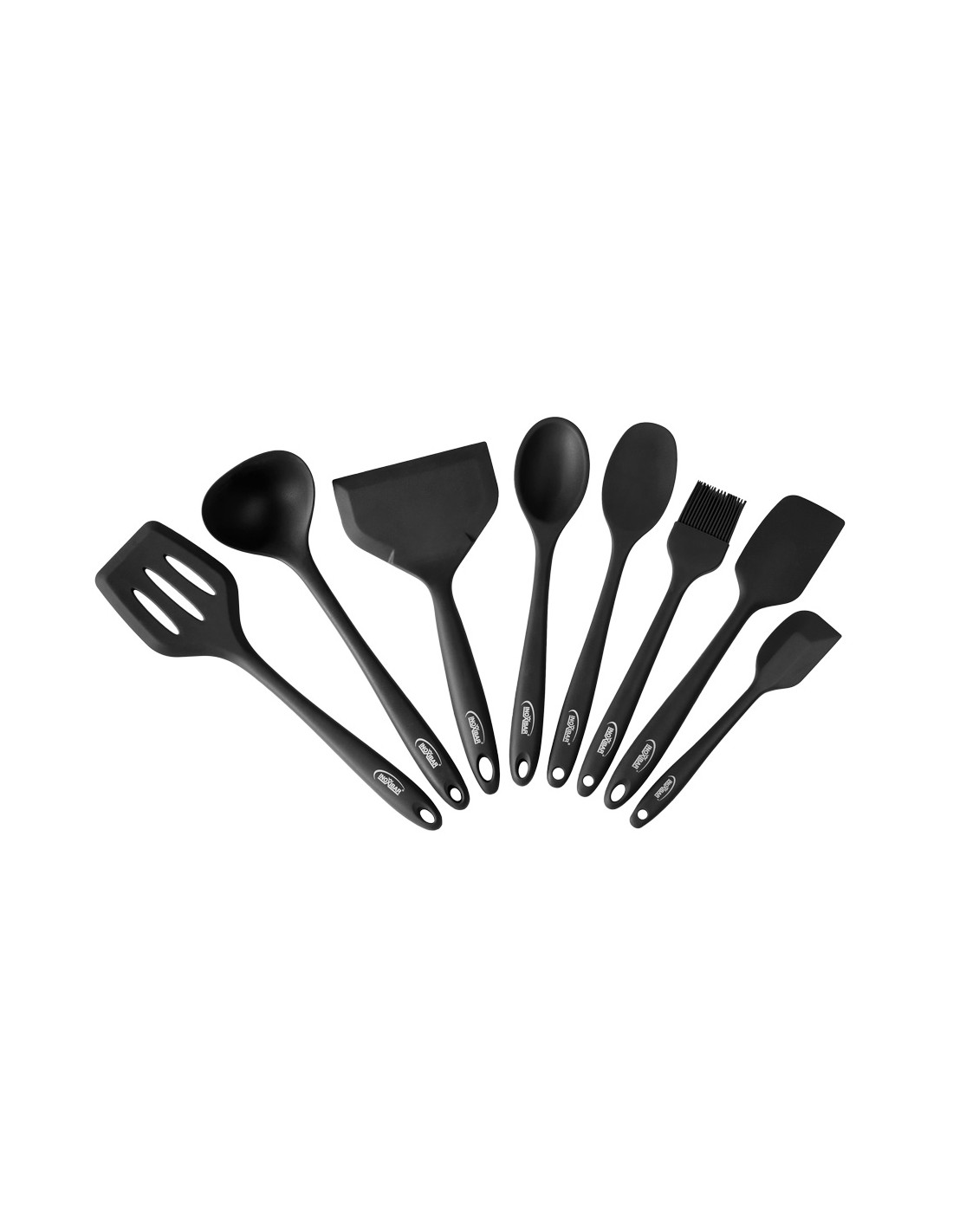 8-piece kitchen utensil set including large and small spatulas, spoon and flat spoon, slotted spatula, ladle, wide spatula, and brush.