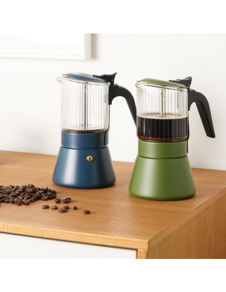 La partie supérieure est en verre borosilicaté très résistant, ce qui vous permet de voir le processus de préparation et de profiter de l’arôme dès les premières secondes. De plus, elle est équipée d’une soupape de sécurité pour une utilisation fiable et d’une poignée en bakélite thermo-isolante garantissant une prise en main confortable et solide.